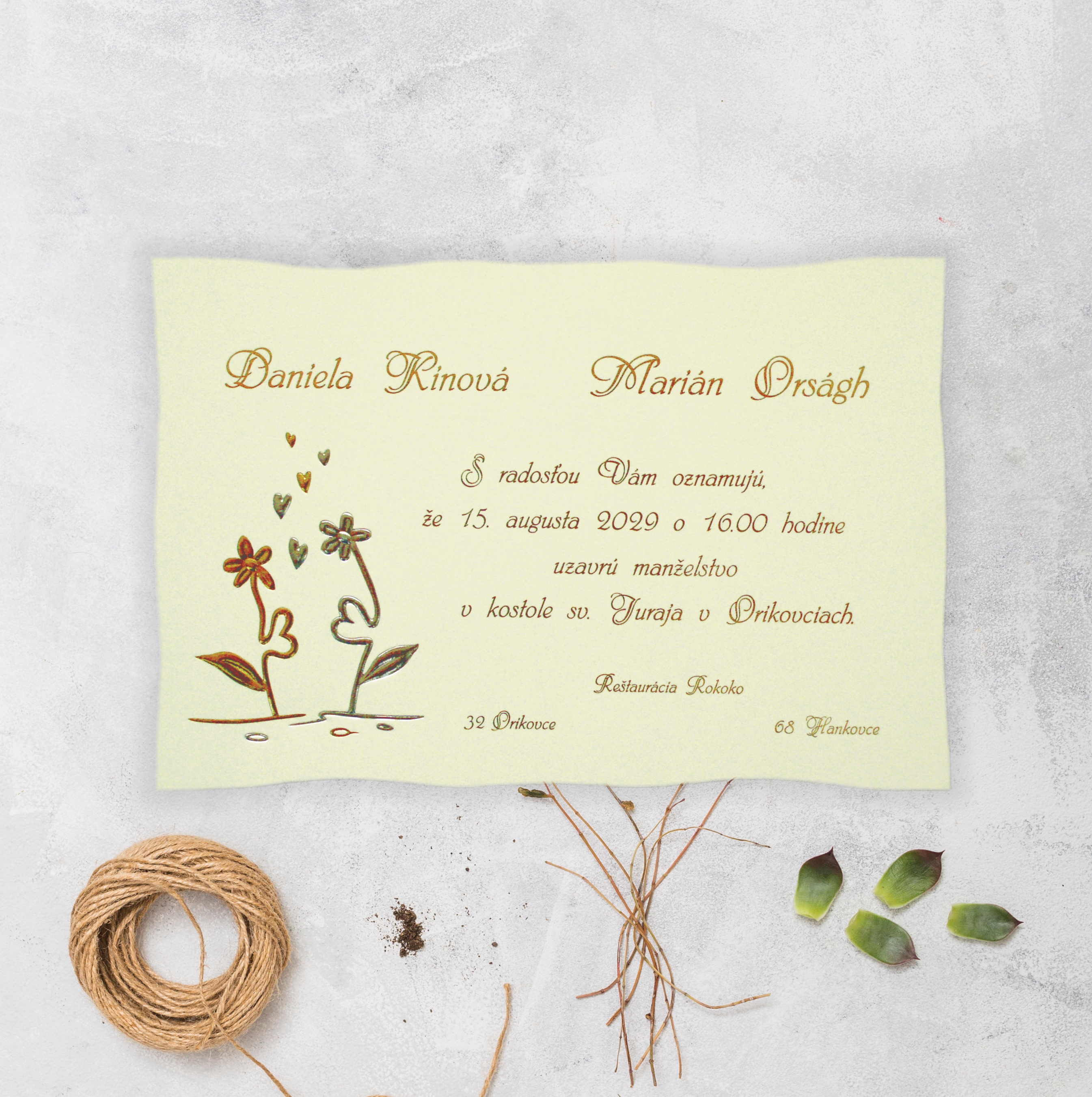 Svadobné oznámenia z krémového, natieraného lesklého papiera s tvarovým výsekom a zlatou a striebornou 3D ražbou. Text je natlačený zlatou termoražbou. Rozmer svadobného oznámenia: 150x100 mm