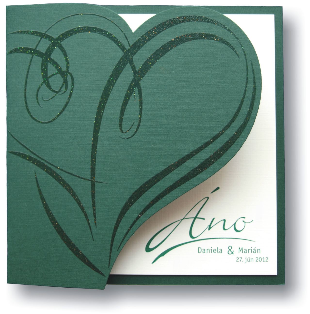 Otváracie svadobné oznámenia s tvarovým výsekom zo zeleného papiera s obojstrannou ražbou pripomínajúcou plátno s trblietavou termogravúrou na prednej strane. Text je natlačený na bielom papieri s obojstrannou ražbou pripomínajúcou plátno. Rozmer zloženého svadobného oznámenia: 145x145 mm
