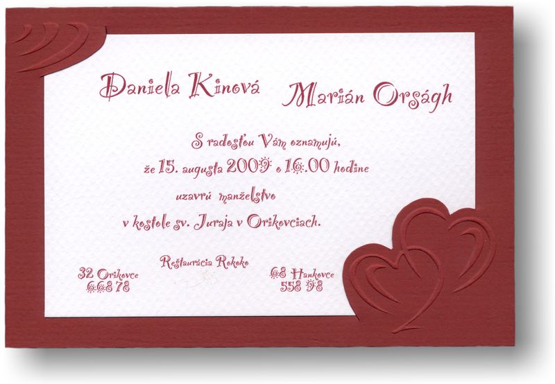 Túto technológiu tlače nie je možné zrealizovať u každého typu svadobného oznámenia. Informujte sa na Táto e-mailová adresa je chránená pred spamovacími robotmi. Na jej zobrazenie potrebujete mať nainštalovaný JavaScript.