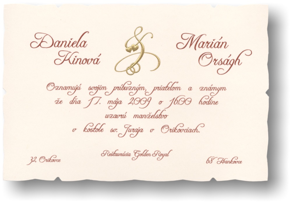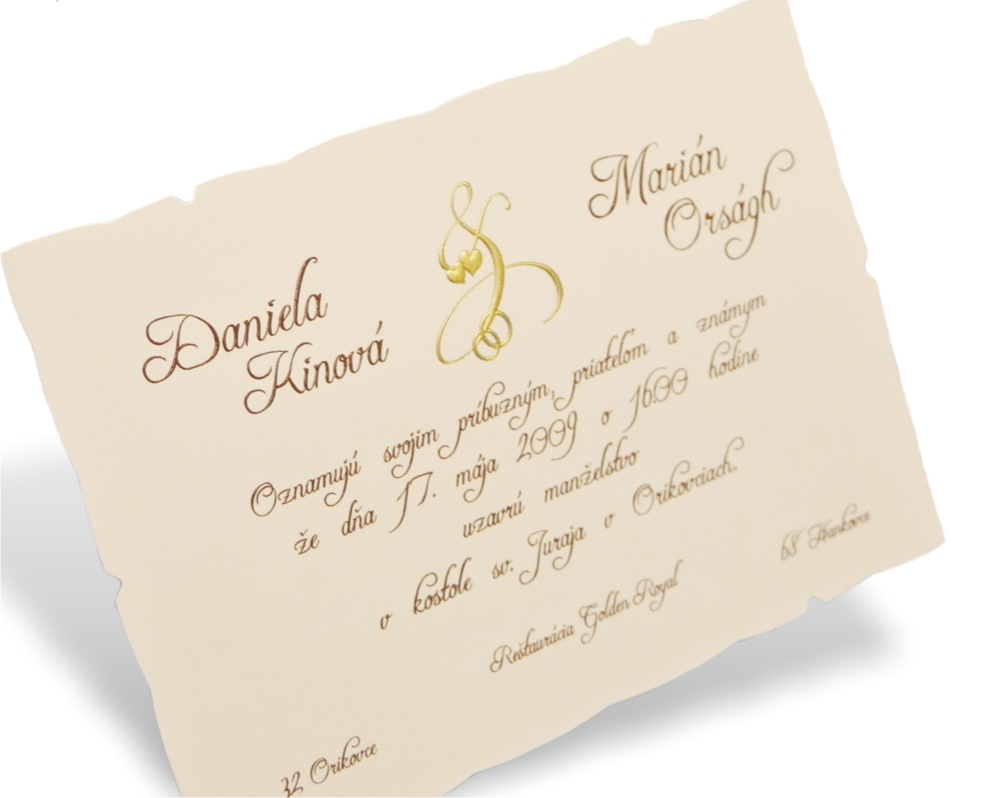 Túto technológiu tlače nie je možné zrealizovať u každého typu svadobného oznámenia. Informujte sa na Táto e-mailová adresa je chránená pred spamovacími robotmi. Na jej zobrazenie potrebujete mať nainštalovaný JavaScript.
