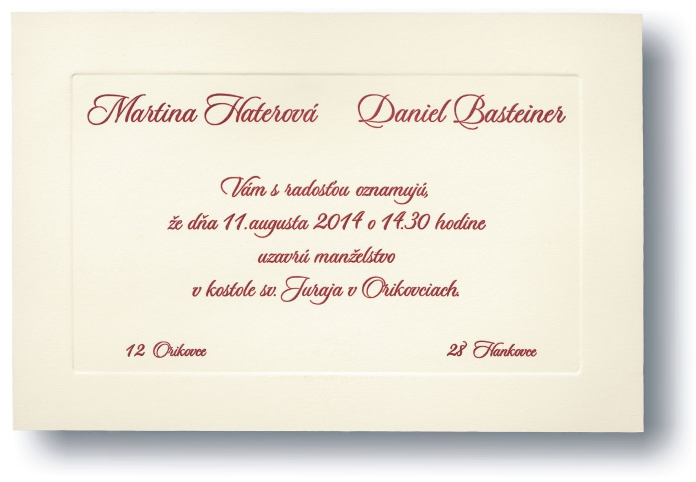 Túto technológiu tlače nie je možné zrealizovať u každého typu svadobného oznámenia. Informujte sa na Táto e-mailová adresa je chránená pred spamovacími robotmi. Na jej zobrazenie potrebujete mať nainštalovaný JavaScript.